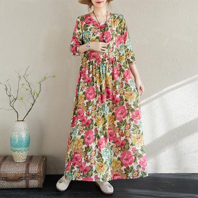 DIMANAF 2025 Damen Übergröße Frühling Neu Locker Kleid Leinen Urlaub Lässig Vintage Basic Floral Elegant Langes Kleid