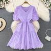 Sommer Kleine Frische Alter-reduzierung Süße Blase Kurzen ärmeln V-ausschnitt Hohl Stickerei Taille Krawatte Dünnes Kleid Frauen