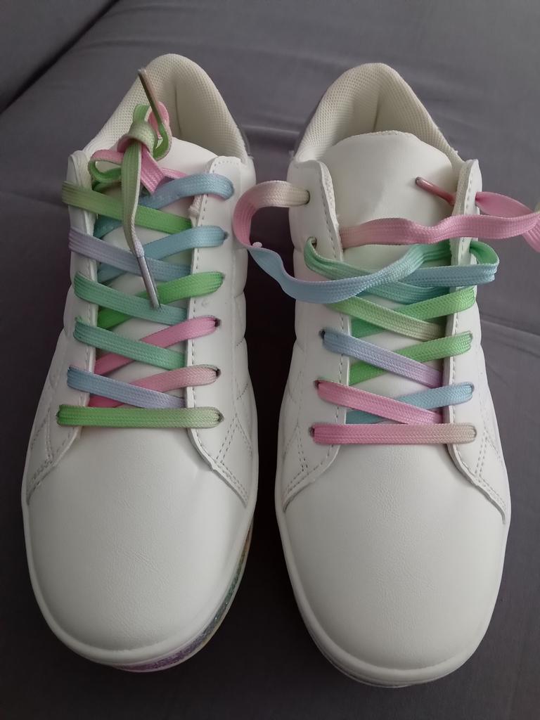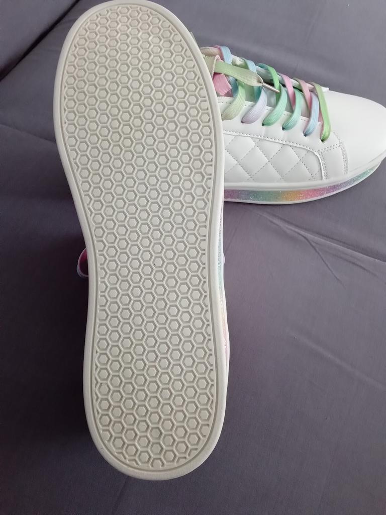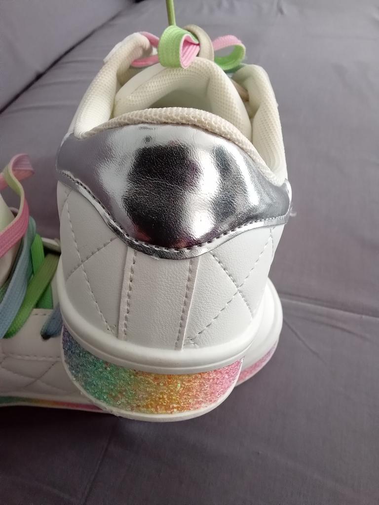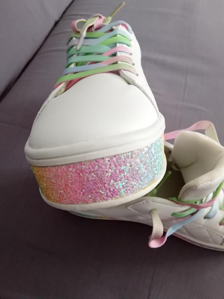 Hübsche ausgefallene Sneaker aus Synthetikmaterial, mit Pailletten und farbigen Schnürsenkeln. 👍💝 Die Löcher für die Schnürsenkel haben keine Ösen und bleiben empfindlich. 🥹👎 Das Modell fällt klein aus, es ist besser, die größere Größe zu bestellen. 😁🤔