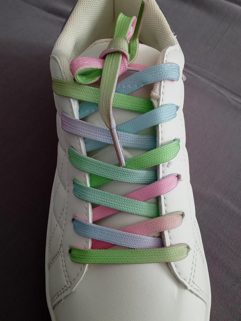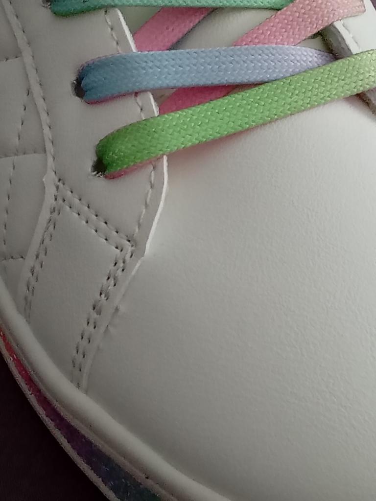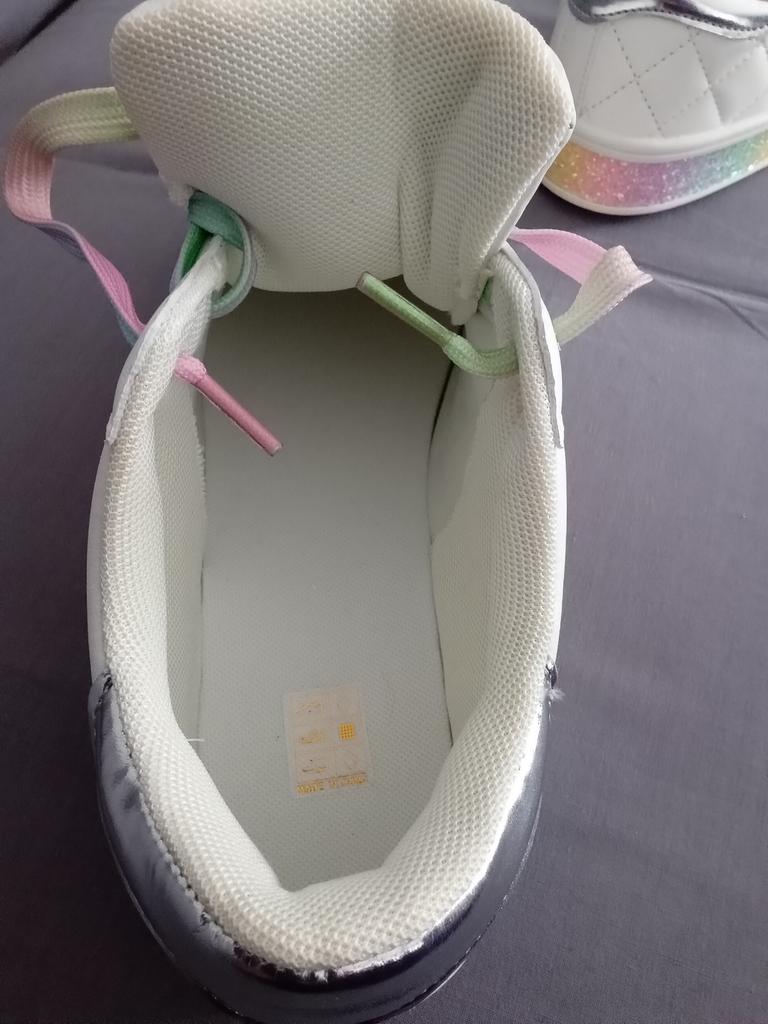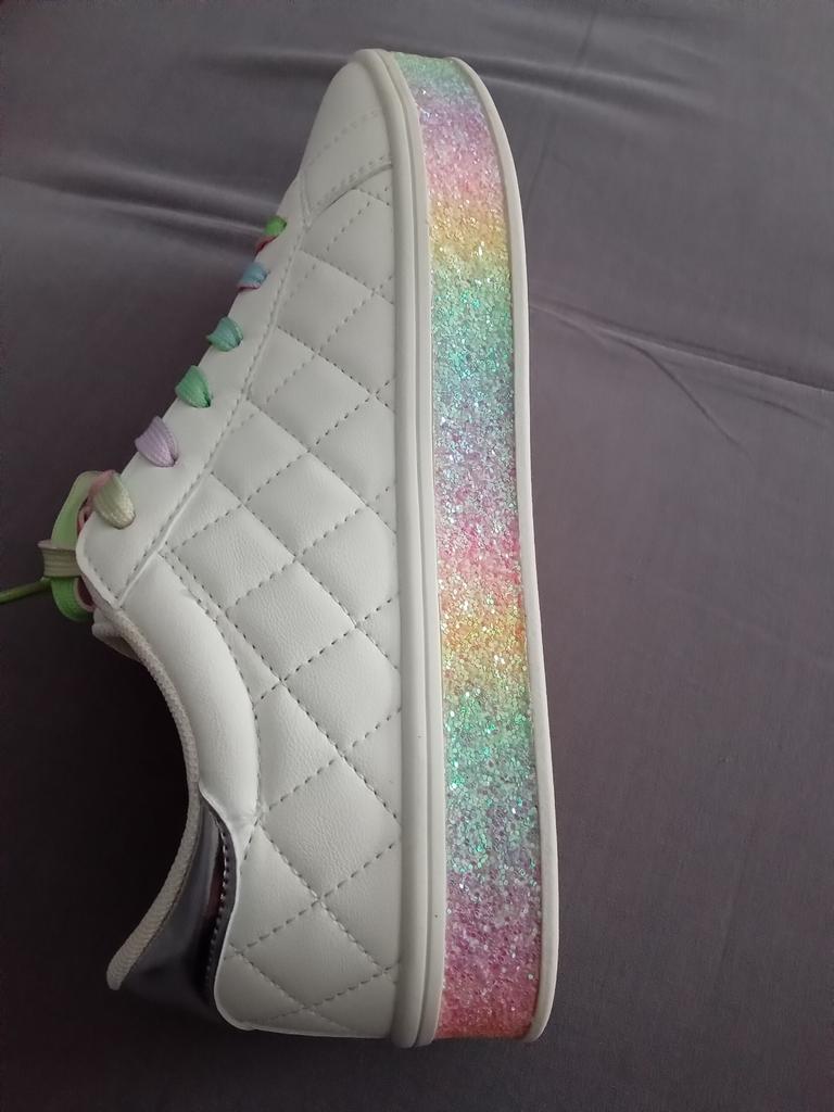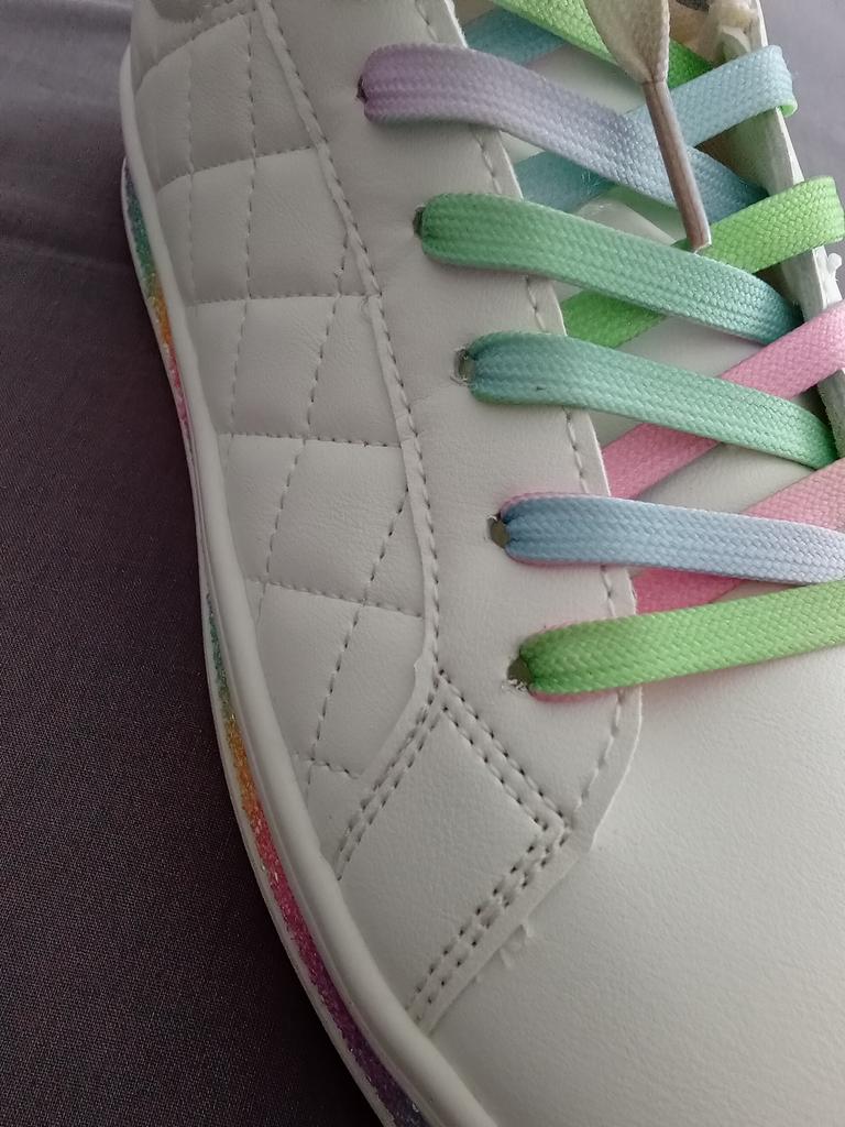 Hübsche ausgefallene Sneaker aus Synthetikmaterial, mit Pailletten und farbigen Schnürsenkeln. 👍💝 Die Löcher für die Schnürsenkel haben keine Ösen und bleiben empfindlich. 🥹👎 Das Modell fällt klein aus, es ist besser, die größere Größe zu bestellen. 😁🤔