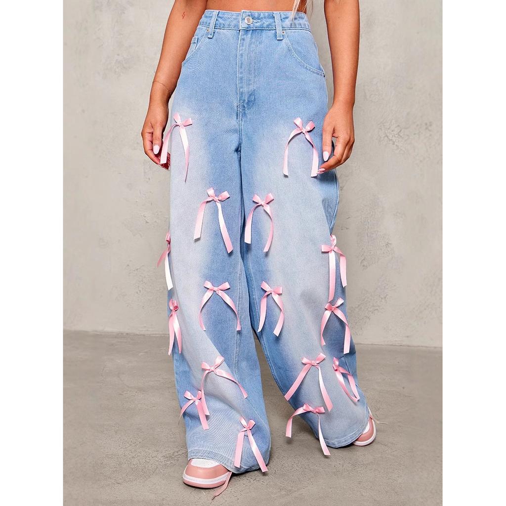 Damen Vintage High Waist Flared Jeans mit Schleifendetail und weitem Beindesign Retro Washed Denim Pants mit stylischen Taschen