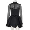 Damen Schwarzes Satin Mini Kleid Stehkragen Mesh Ärmel Ballonrock Abendparty Elegant Formelle Kleidung Slim Fit Cocktailkleidung