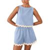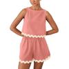 Damen Sommer Zweiteiler Leinen Spitzenrand Rundhals Westenoberteil Shorts