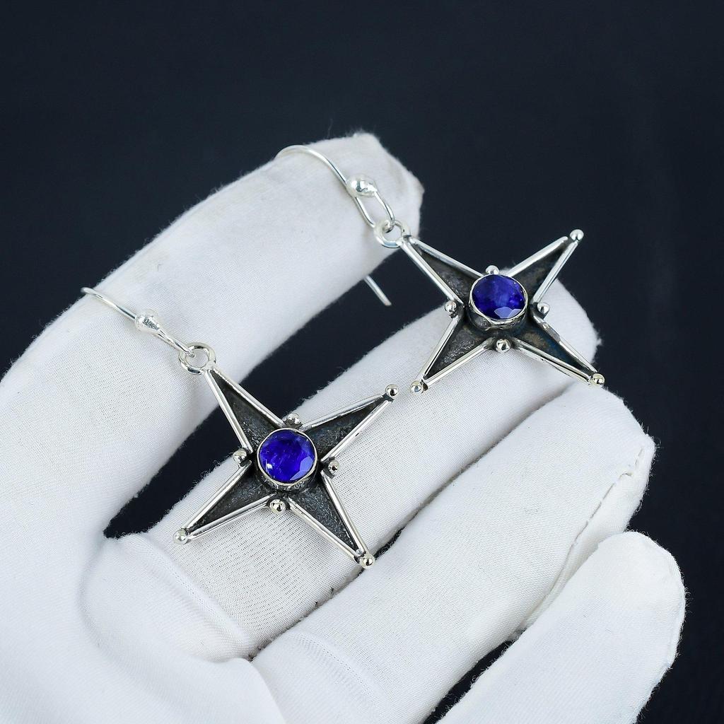 Erstaunliche Ohrringe mit blauem Saphir-Edelstein in Sternform, 925er Sterlingsilber-Ohrring, handgefertigter Boho-Silberschmuck, Hängeohrringe, Geburtstagsgeschenk