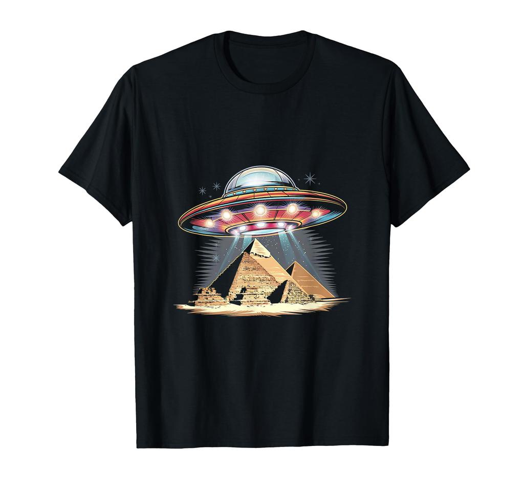 Entdecken Sie die Schnittstelle zwischen Science-Fiction und antiker Mythologie in diesem lebendigen UFO-über-Pyramiden-Design. Perfekt für Alien-Fans, Verschwörungstheoretiker und Fans antiker Mysterien.