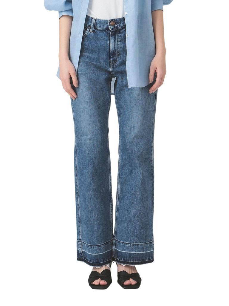 The model "Peace" is based on the "Laura", which is a modern update of the 70's trendy design, with a shorter length and slightly revised flare. By emphasizing the flare, we recreated the denim worn by hippies at the time, which is the name of the model. The hem is made by untying the two rolls of the trousers. A unique piece that incorporates a modern approach into nostalgia.