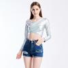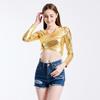【Metallisch glänzendes Crop-Top für Damen】- Unser modisches, metallisch glänzendes Tanz-Crop-Top für Damen besteht aus hochwertigem Polyester und Elasthan, hat einen schönen metallischen Glanz, ist sehr dehnbar, weich, leicht, atmungsaktiv und angenehm zu tragen. Glänzendes Aussehen, Kreuzwickeldesign vorne, V-Ausschnitt, lange Ärmel, verkürzte Länge.