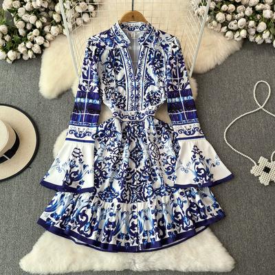 Frühling Sommer Frauen Print Rüschen Einreiher Shirt Mini Kurze Party Kleider mit Gürtel