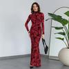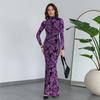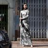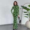 Elegantes Maxikleid mit O-Ausschnitt und Print für Damen, volle Ärmel, figurformendes Gewand, Kleider für Damen, Abendgarderobe, Vestidos