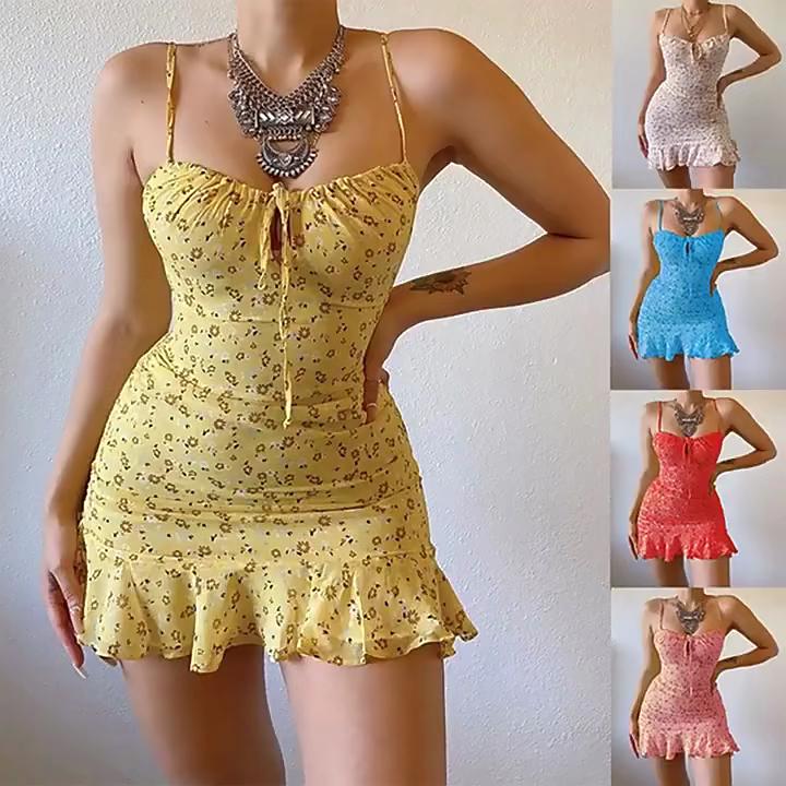 Kleider mit Spaghetti-Trägern mit Blumendruck Damen Sexy Tiefer Ausschnitt Ausgeschnitten Zum Schnüren Paket Hüfte Rüschen Mini-Kleid Weiblich Vestidos 2024