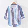 Herren Frühling und Sommer Locker Dünner Abschnitt Gestreift Sieben-Minuten-Ärmel Hemd Jugend Quadratischer Kragen Atmungsaktiv Lässige Oberteile