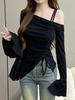 Süß Sexy Kordelzug Schleife Weiß Off-Shoulder Oberteil Damen Basic Langarm Body T-Shirt Elegant Trompetenärmel Damen T-Shirts