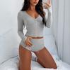 2-teiliges Pyjama-Set für Damen, figurbetonte Shorts + langärmliges V-Ausschnitt-Button-Down-Top, sexy Y2K-Set, Loungewear