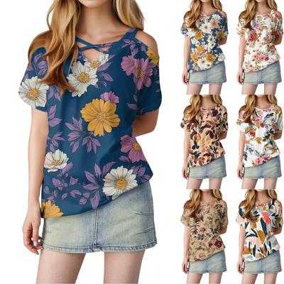 Lässiges, schulterfreies, kurzärmliges T-Shirt mit V-Ausschnitt und Blumendruck für Damen