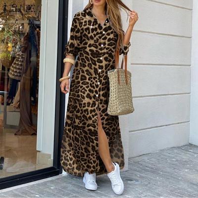 Damen-Kleid mit Leopardenmuster, V-Ausschnitt, langärmelig, Maxikleid, lässig, lockere Passform, Frühlings- und Sommerkleid für Büro, Alltag, Urlaub, Party