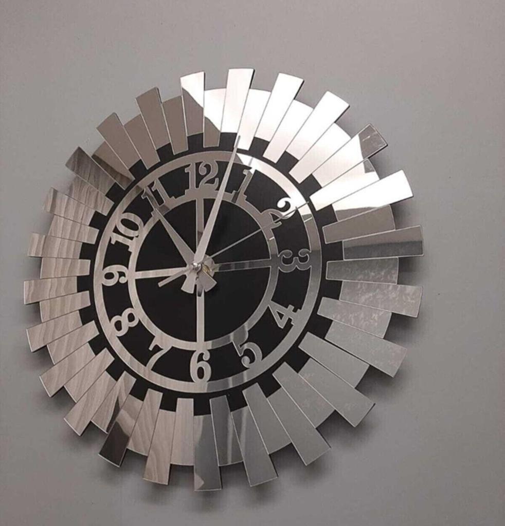 Moderne Wanduhr mit silberner Sonne, dekorative türkische Ziffern, MDF, verspiegeltes Plexiglas, 40 x 40 cm