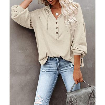 Einfarbiges Sweatshirt für Damen mit V-Ausschnitt, geknöpfter Kapuze, lockerem Langarm-Top