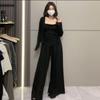 Lässiges dreiteiliges Set für Damen: Unregelmäßiger Cardigan mit Hosenträgern und bodenlanger Hose mit hoher Taille für Frühling und Herbst