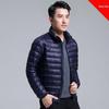Leichte Daunenjacke mit Kapuze für Herren – mittleres Alter und ältere Menschen, Stehkragen, Nebensaison, große Größe.