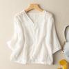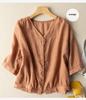 Entdecken Sie zeitlosen Stil und Komfort mit diesem retro-inspirierten Oberteil, gefertigt für die moderne Garderobe.. Dieses Oberteil aus einer atmungsaktiven Baumwoll-Leinen-Mischung ist perfekt für die wärmeren Jahreszeiten Frühling und Sommer.. Es hat eine lockere Passform, die sowohl Komfort als auch eine schmeichelhafte Silhouette bietet.. Der V-Ausschnitt verleiht einen Hauch von Eleganz, während die Dreiviertelärmel einen vielseitigen Look bieten, der gut zu einer Vielzahl von Outfits passt.. Perfekt sowohl für lässige Ausflüge als auch für elegantere Anlässe, ist dieses Oberteil eine unverzichtbare Ergänzung für Ihre saisonale Garderobe.