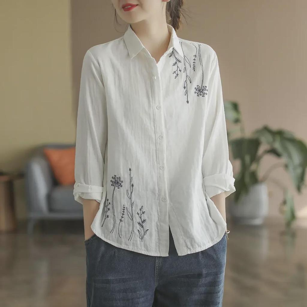 Dieses elegante Damenhemd ist perfekt für die Frühlings- und Herbstsaison. Es besteht aus einer bequemen Baumwoll-Leinen-Mischung und verfügt über lange Ärmel und eine lockere Passform für einen entspannten und dennoch stilvollen Look.. Das Hemd ist mit Retro-Blumenstickereien verziert, die einen Hauch von Vintage-Charme verleihen. Es ist mit einem klassischen Umlegekragen versehen und somit ein vielseitiges Kleidungsstück für jede Garderobe.