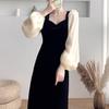 Samtkleid mit langen Ärmeln Französisches Retro-Temperament Taillenbetont und Figurschmeichelnd Quadratischer Ausschnitt Puffärmel Midilanger Rock Herbstkleidung