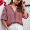 Sommer Neue Vintage Lose Puffärmel Elegante Hemden für Frauen Mode Stickerei V-Ausschnitt Feste Beiläufige Damenblusen Slim Fit Schnürung Lady Tops 26650