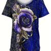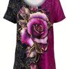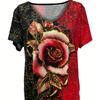 Stylish Rose 3D Print V Neck T-shirt - Women's Casual Short Sleeve Medium Stretch T-Shirts
