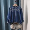 Japanischer Ethno-Stil Rundhals Gewaschener Denim Stickerei Locker Langarmhemd Damenbekleidung