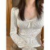 Neuer Herbst/Winter Ausschnitt Patchwork Enganliegend Spitze Süß Blumenspitze zum Schnüren mit Brustpolster Wollig Warm Langarm Oberteil