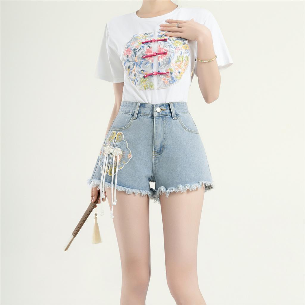 Neuer Chinesischer Stil Nationaler Stil Denim Shorts Damen Sommer Mode Personalisierte Stickerei Nationale Mode A-Linie Hotpants