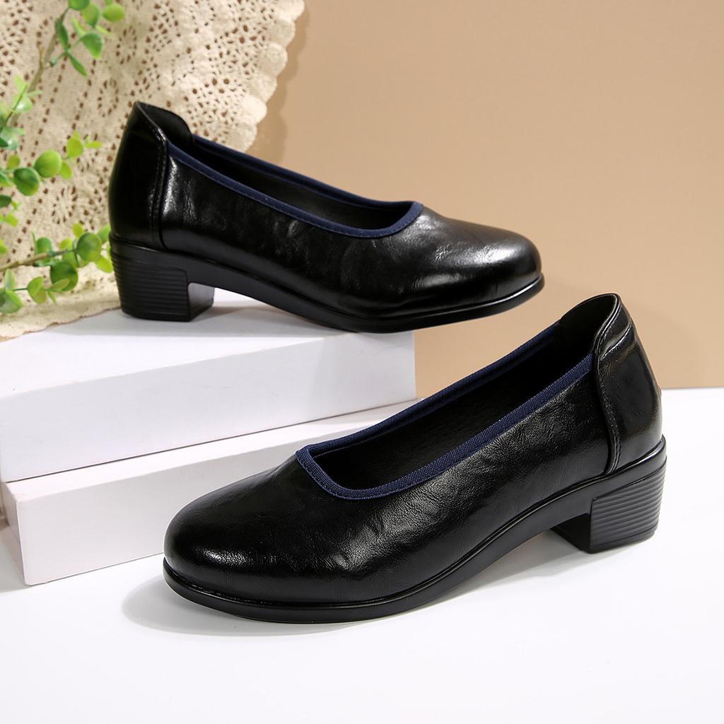 Arbeitsschuhe Damen Schwarz Leder Runde Spitze Leichte Öffnung Dicker Absatz Einzelne Schuhe Bequeme Weiche Sohle Professionelle Arbeit Lederschuhe Mittelhoher Absatz