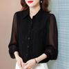 Entdecken Sie mühelose Eleganz mit diesem raffinierten schwarzen Chiffon-Langarmhemd, perfekt für Frühling, Herbst und Winter 2023.. Dieses Hemd aus leichtem Chiffonmaterial bietet eine lockere Passform für Komfort und Stil.. Das einfarbige Muster erhöht seine Vielseitigkeit und macht es zu einer schicken Ergänzung für jede Garderobe.. Mit einem Umlegekragen und langen Ärmeln verbindet es nahtlos traditionelle Elemente mit zeitgenössischem Design, ideal sowohl für lässige als auch formelle Anlässe.