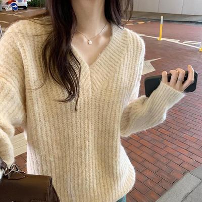 Neuer V-Ausschnitt Lazy-Pullover für Damen Herbst und Winter neuer koreanischer Stil verdickt weich und wachsartig vielseitiges Basic-Oberteil