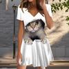 Sommermode Damen V-Ausschnitt Kurzarm Schwarze Katze Gedrucktes Kleid Sexy Kurzer Rock Kleider