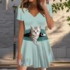 Sommermode Damen V-Ausschnitt Kurzarm Niedliches Kätzchen bedrucktes Kleid Sex Kurzer Rock Kleider