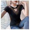 Damen Sommer Spitzen V-Ausschnitt Kurzarm T-Shirt Einfarbig Slim Strick Unterhemd