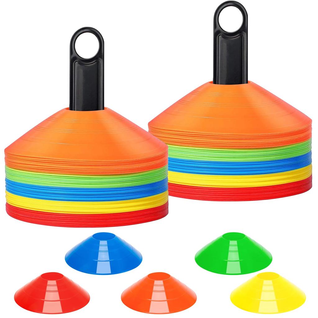✅Products include: 100 x marker cones, 2 x bags, 2 x holders. (Red x20, Blue x20, Green x20, Orange x20, Yellow x20)