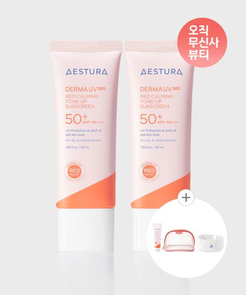 AESTURA Derma UV365 Red Calming Tone Up Sunscreen 40ml 2ea is a tone-up sunscreen that calms the skin that has been irritated and reddened by UV rays and external environments while evening out the skin tone. This product features a powerful UV protection function with SPF 50+ / PA++++, effectively shielding the skin from external elements and providing a makeup-like clean skin expression with a natural tone-up effect.