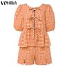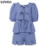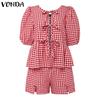 VONDA Damen Sets Kurzarm Schleifenknoten Karomuster Oberteile und Shorts mit elastischer Taille Outfits