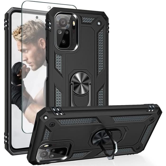 Hülle für Redmi Note 10 4G - Schwarz - Gehärtetes Glas - Stützring - Verstärkter Schutz