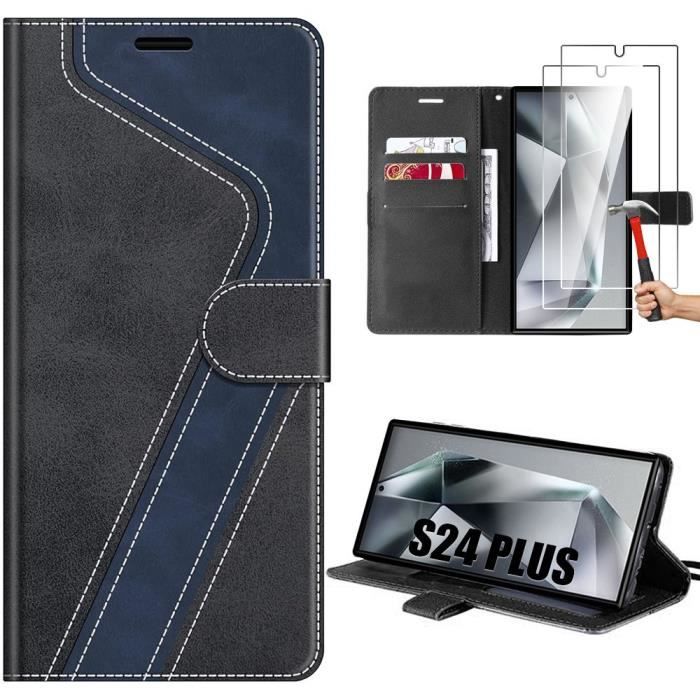 Hülle und gehärtete Gläser für Samsung Galaxy S24 Ultra - Lederoptik - Kratzschutz - Marineblau-Schwarz