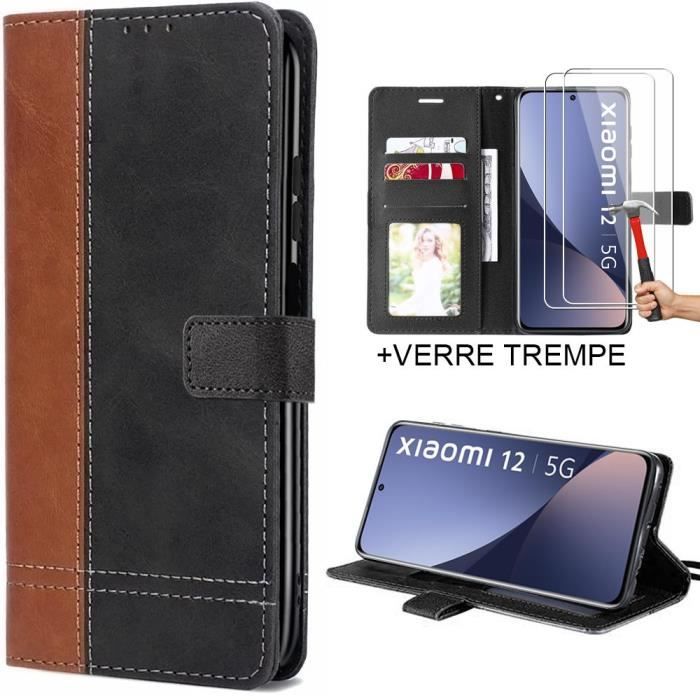 Flip Case Hülle mit 2 gehärteten Gläsern für Xiaomi 12 - 12X - Lederoptik Schwarz-Braun