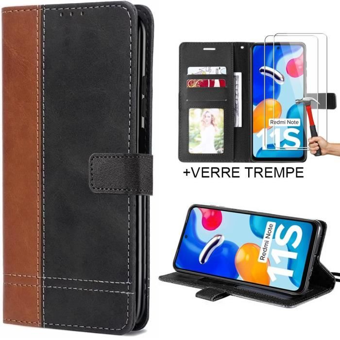 Hülle - E.F.CONNECTION - Für Xiaomi Redmi Note 11S - Lederoptik Braun-Schwarz - 2 gehärtete Gläser - Integrierter Ständer