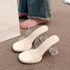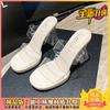 Auf Scheiße treten, wasserfester Tisch mit dicker Unterseite, transparentes Wort mit hochhackigen Hausschuhen, Frauen tragen Kristall- und dickabsatzige coole Hausschuhe in s