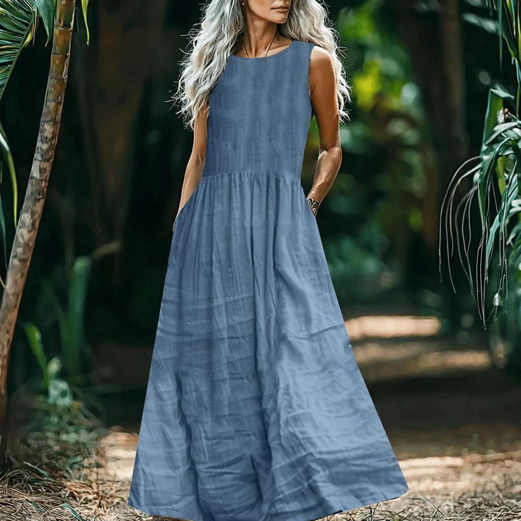 Modisches und lässiges einfarbiges Kleid aus Baumwolle und Leinen für Damen