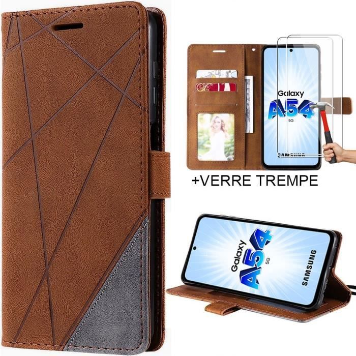 Hülle für Samsung Galaxy A54 5G + 2 Panzergläser, Schutz Lederoptik Braun Klappbar