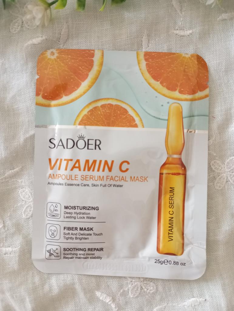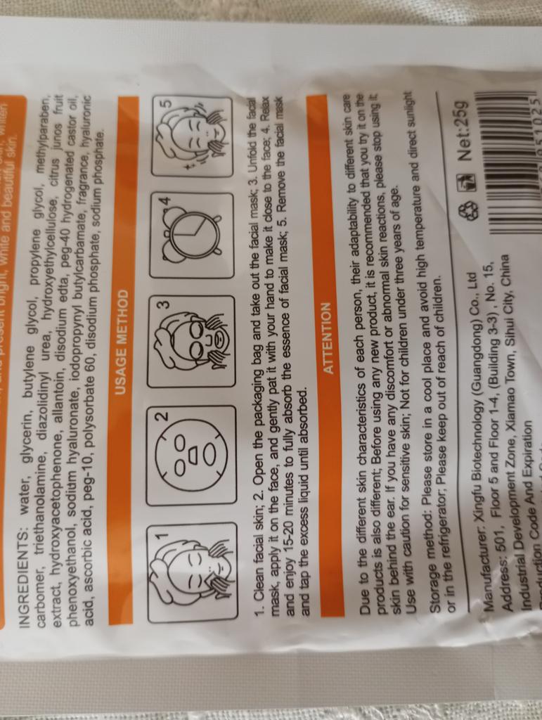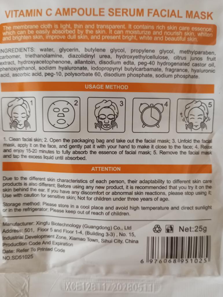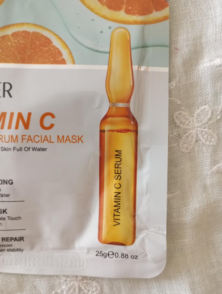 Feuchtigkeitsspendende Tuchmaske für das Gesicht mit Vitamin C Innen ist viel Flüssigkeit, riecht angenehm Die Maske ist weiß und hat eine Standardform, sie erfüllt ihre Funktionen, bei regelmäßiger Anwendung ist die Haut ausgeruht und gestrafft. Die Eindrücke sind äußerst positiv