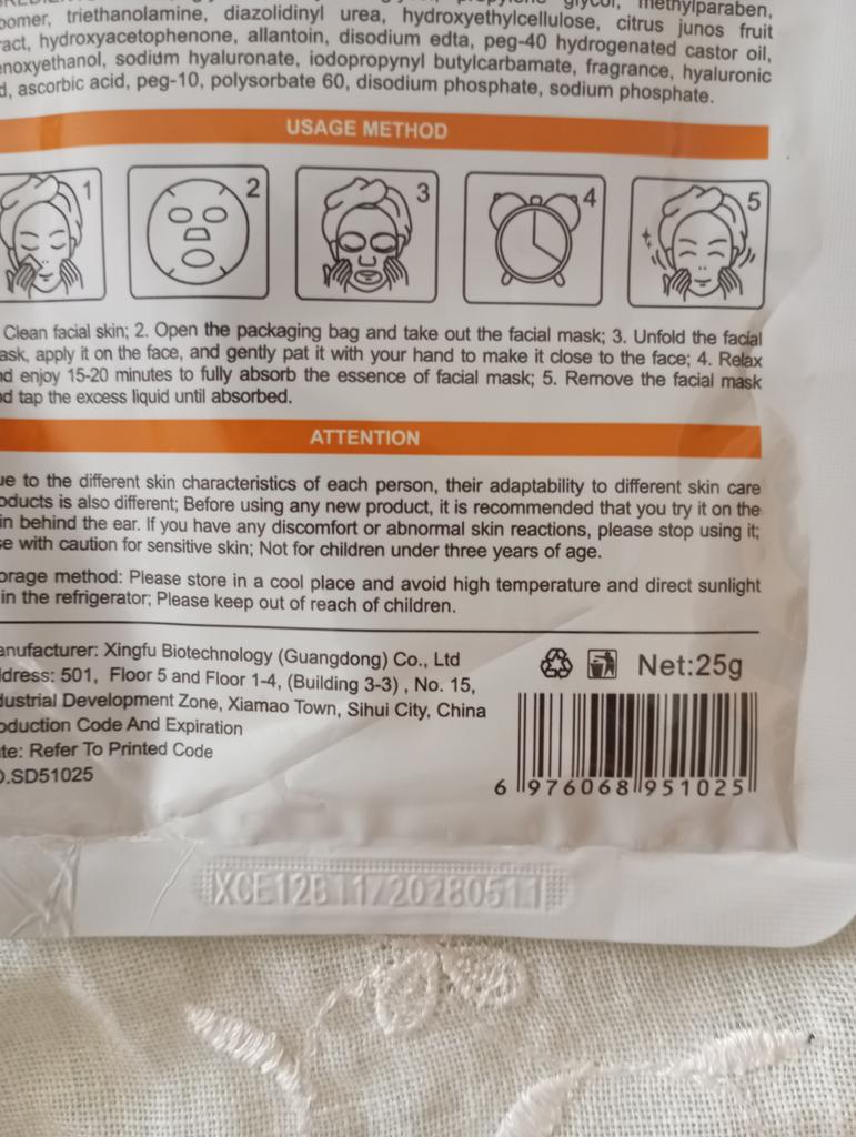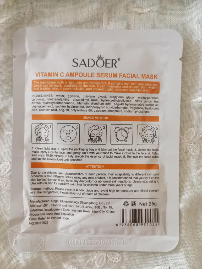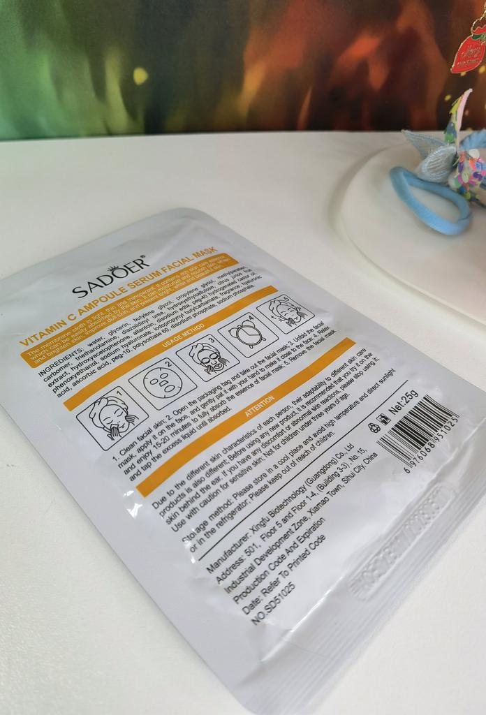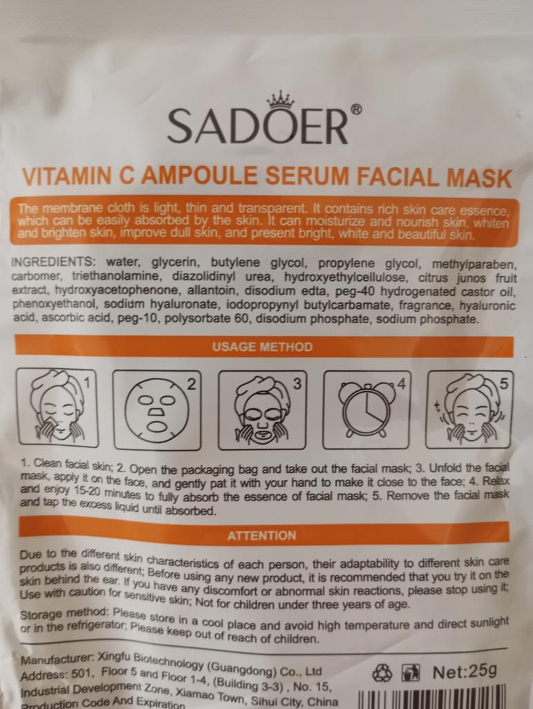 Feuchtigkeitsspendende Tuchmaske für das Gesicht mit Vitamin C Innen ist viel Flüssigkeit, riecht angenehm Die Maske ist weiß und hat eine Standardform, sie erfüllt ihre Funktionen, bei regelmäßiger Anwendung ist die Haut ausgeruht und gestrafft. Die Eindrücke sind äußerst positiv