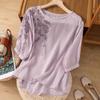 Women's Solid Color Cotton And Linen Short-sleeved Embroidered Retro Breathable T-shirt Round Neck Top